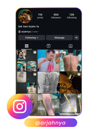 Born and raised in Bangkok, Ajarn Ya discovered his calling to the sacred art of Sak Yant at a young age. Unlike many who might seek fortune elsewhere, he chose to remain in Khlong Toei, one of the city’s most challenging neighborhoods.